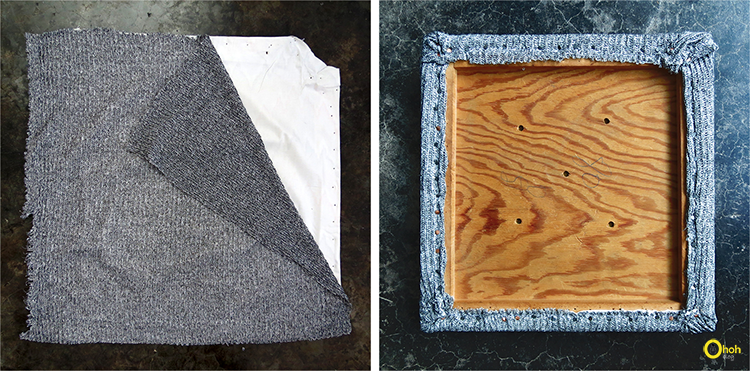 Après quelques années, il était temps de la rafraîchir avec un nouveau tissu. J’ai choisi un tricot gris, un tissu très élastique. Ce n’est donc pas une matière facile à travailler sur les meubles.