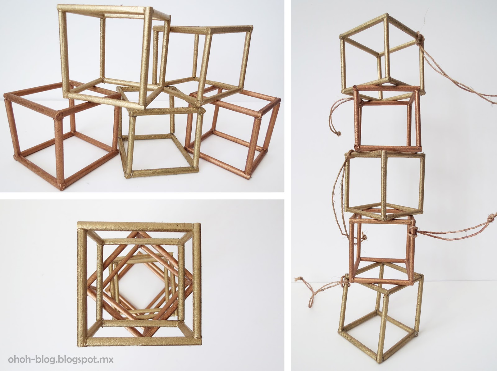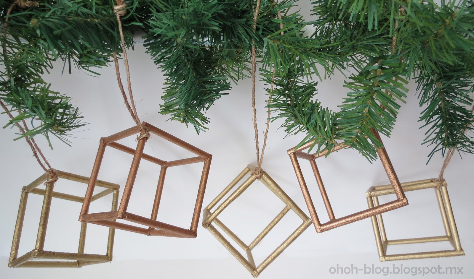 A simple and fast idea to decorate the Christmas tree, making cubes with wood sticks and painting them in gold.