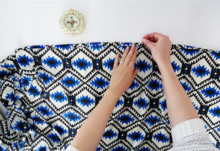 Fold the fabric in the middle, wrong side out and the bottom hem on one side. Place both edges on top of each other and pin.