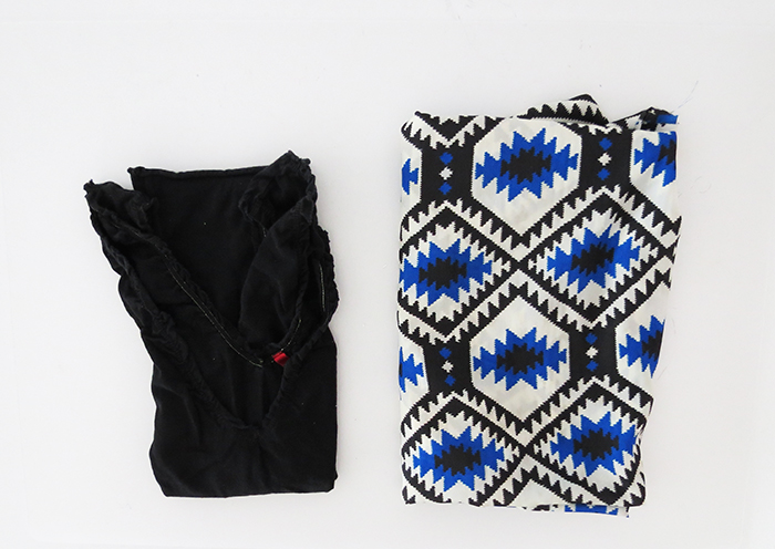 You will need an old t-shirt (a fit size model, your man xxl t-shirt won’t work), one yard of fabric, matching thread, pins, scissors and a sewing machine.