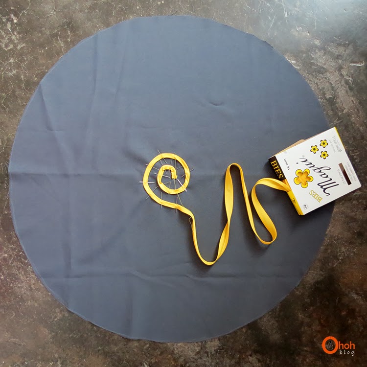 For the second, I just sewed the bias tape on a spiral shape … you can try with other forms. Begins by drawing on the fabric, then pin through and sew following the pattern.