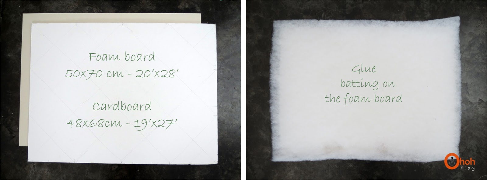 Cut cardboards to desired size and glue the batting on the foam board. Trim the batting to the foam board dimension.
