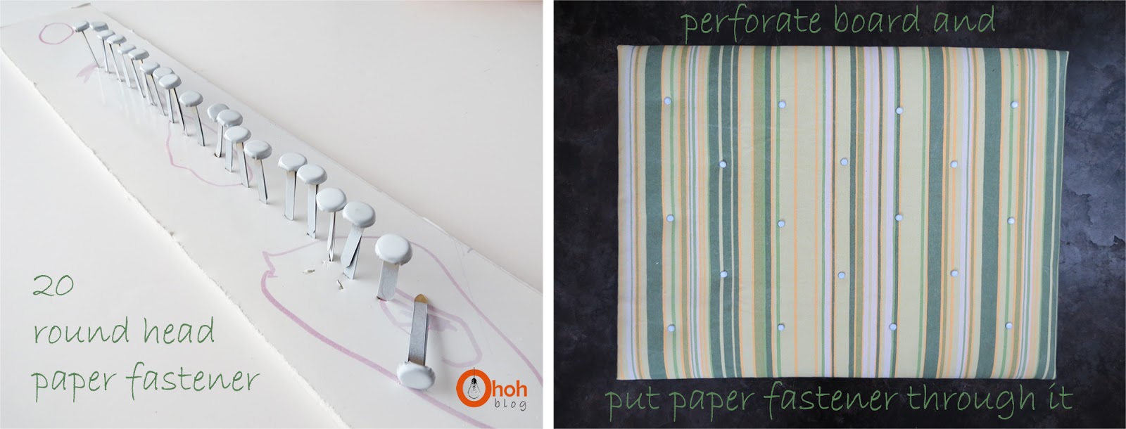 I spray painted the paper fasteners. Perforate the fabric and cardboard to place paper fasteners. Carful, you must accurately measure the distance between fasteners, you must be able to drag a photo between them.