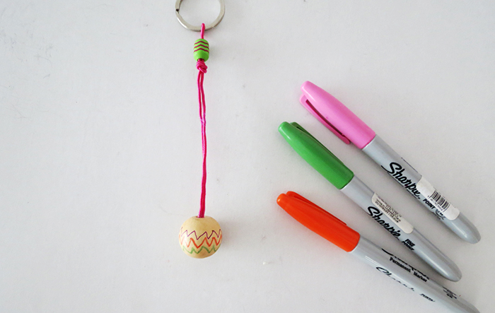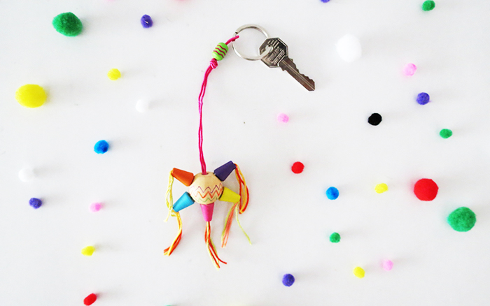 A little key chain inspirated by the traditional Mexican pinata, the perfect little gift for 5 de Mayo. It’s quite simple to make, you will need a few wooden beads, yarn, some string and a key ring.