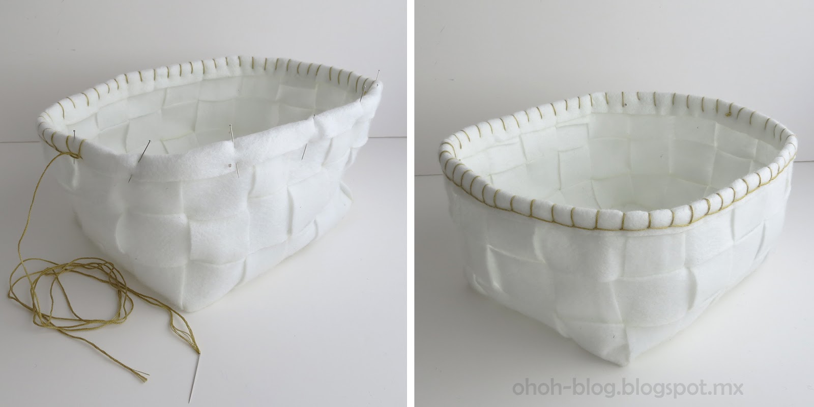 Cut felt in strips and braid at the size of the bottom of the container, fix with pins and sew. It may work with glue, let me know if you try!
