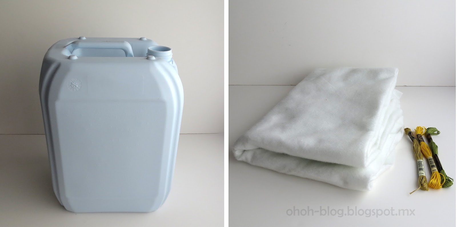 Today an easy idea to create a recycled basket! You gonna need a plastic container (I used a bleach bottle but anything you have around should work), felt and embroidery thread.