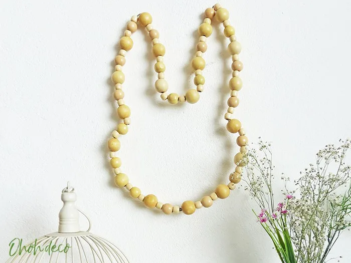 If you like fresh and modern Easter decor, this Easter bunny wreath made of wooden beads will please you.